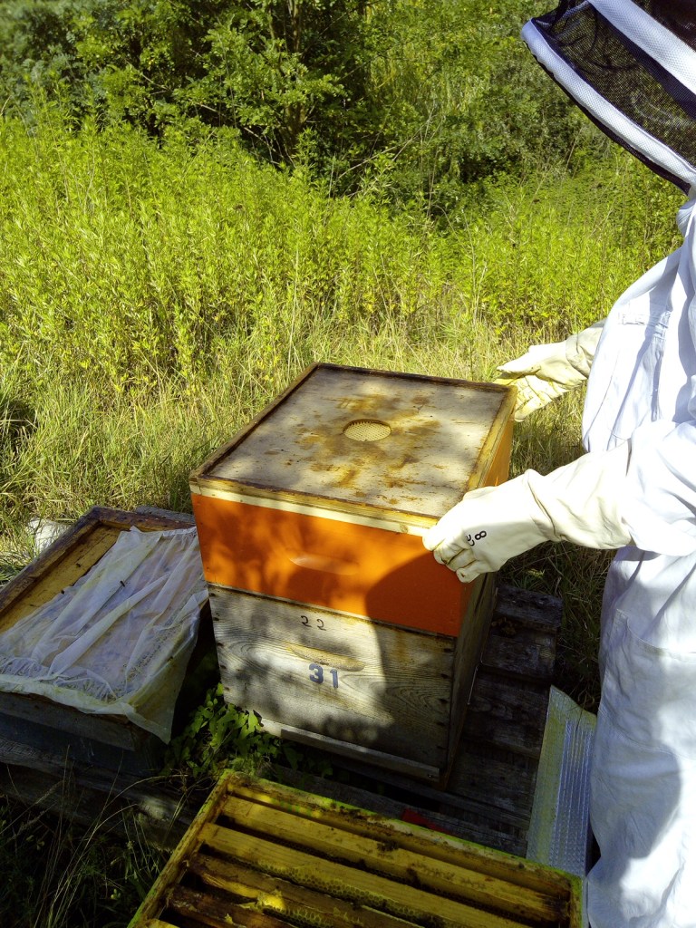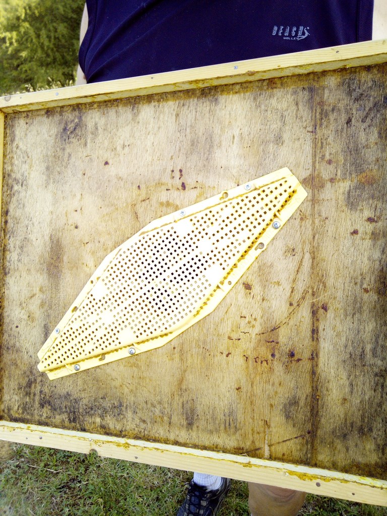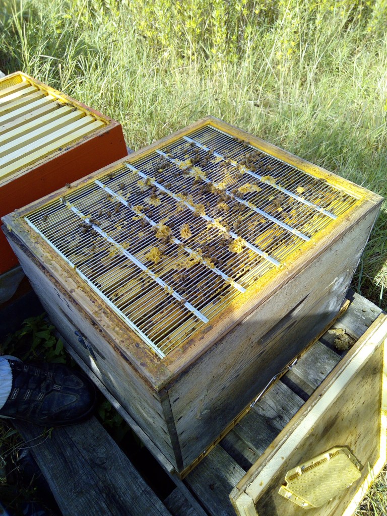 elles ont ensuite du mal a retrouver le passage pour remonter dans les hausses. 24h après nous revenons récupérer les hausses supérieures, il ne reste que quelques abeilles dans celle ci,