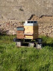 On déplace de 20 cm la ruche mère et on accole la ruchette à celle-ci à l’emplacement ou était la ruche. On les dispose légèrement en éventail,