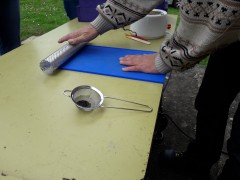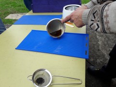 Une fois la cire chaude, verser à la louche (oubliée ce jour) la cire sur la plaque