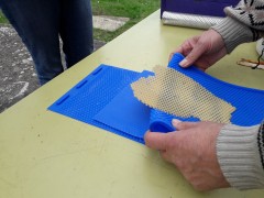 Utiliser uniquement de la cire d’opercule de hausse, ou de la cire de cadre de hausse, ou de la cire cassée de plaques qu’il vous reste.