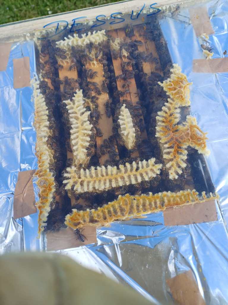 Et nous plaçons des cadres à tirer au cœur de la ruche ou + en latéral selon la force de la ruche. ( voir photo jointe ou nous voyons les deux cadres à tirer de couleur plus clair)